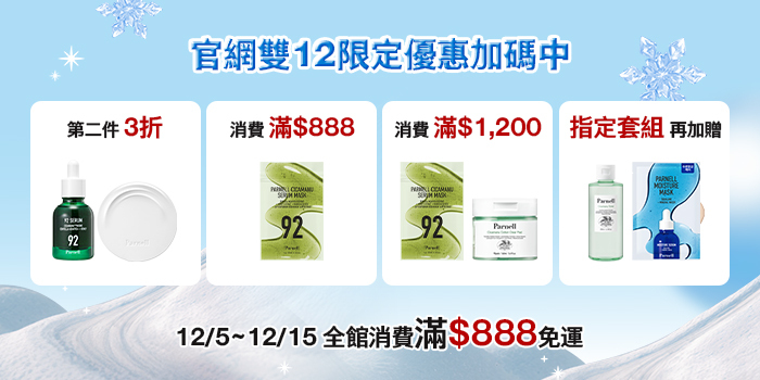 至2025-12-16T04:00:00.000+00:00截止 全店,【雙12限時優惠🎈】滿$888贈 積雪草精粹面膜