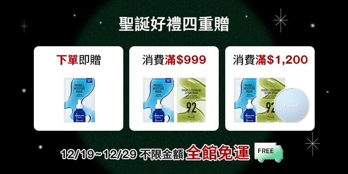 至2025-12-30T04:00:00.000+00:00截止 全店,【聖誕限定🎄】滿$999贈 積雪草精華面膜(袋裝7入)
